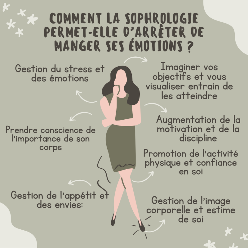 La sophrologie est utilisée pour développer une conscience des signaux de faim et de satiété du corps, ce qui peut aider à réduire la tendance à manger en réponse à des envies ou à des émotions plutôt qu'à la faim réelle.
